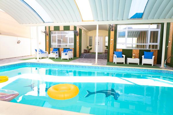 Welcome to Al Sadfa Rest House, where families, kids, and girls can make unforgettable memories. Our cozy rest house features three bedrooms, a living room, and a dining table, providing ample space for relaxation and fun. The outdoor seating area offers stunning views, while the indoor kitchen is fully equipped for your convenience. Kids will love the playground and indoor swimming pool, while adults can unwind in the adult swimming pool. With Wifi, TV, and a coffee machine, you'll have all the comforts of home. Book your stay at Al Sadfa Rest House now!